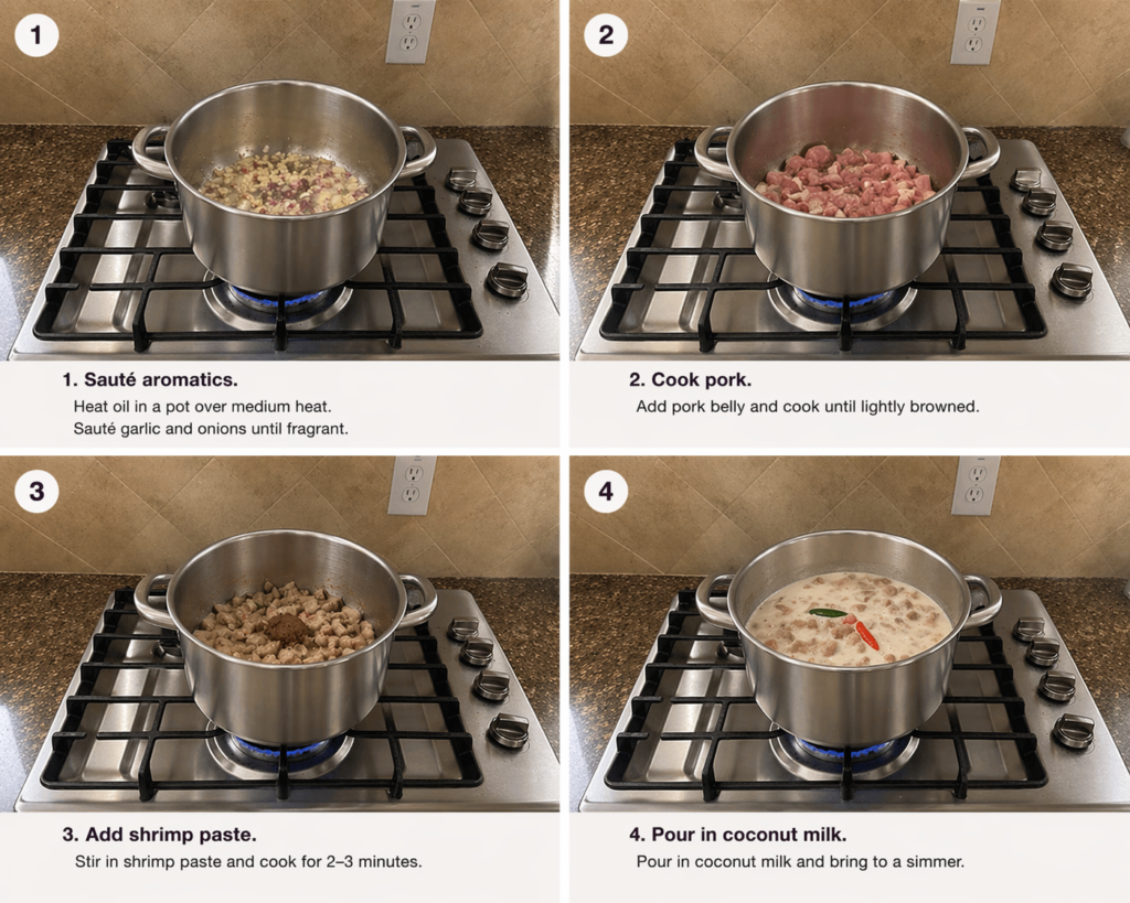 - Stir in shrimp paste and cook for 2–3 minutes.