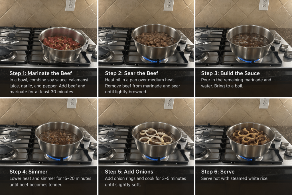 The tangy soy-calamansi sauce paired with tender beef and sweet onions creates a perfect balance of flavors that feels like home in every bite. Whether you’re cooking for your family or sharing Filipino flavors with friends, this dish is simple, hearty, and unforgettable.