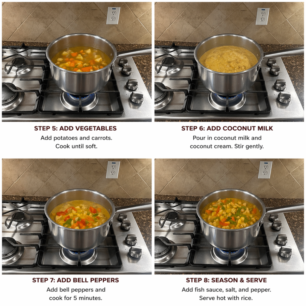 Learn how to cook Filipino chicken curry with coconut milk, potatoes, and carrots. This easy Pinoy-style curry is creamy, flavorful, and perfect with rice.