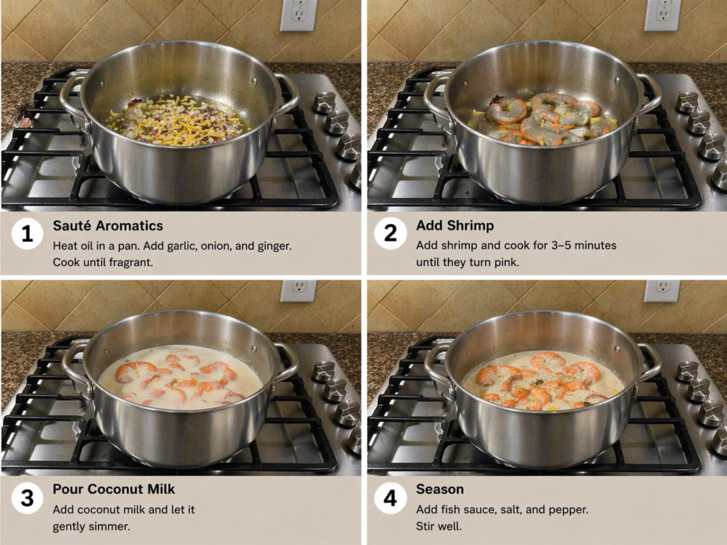 SautΓ© β Add shrimp β Add coconut milk β Season β Simmer β Serve