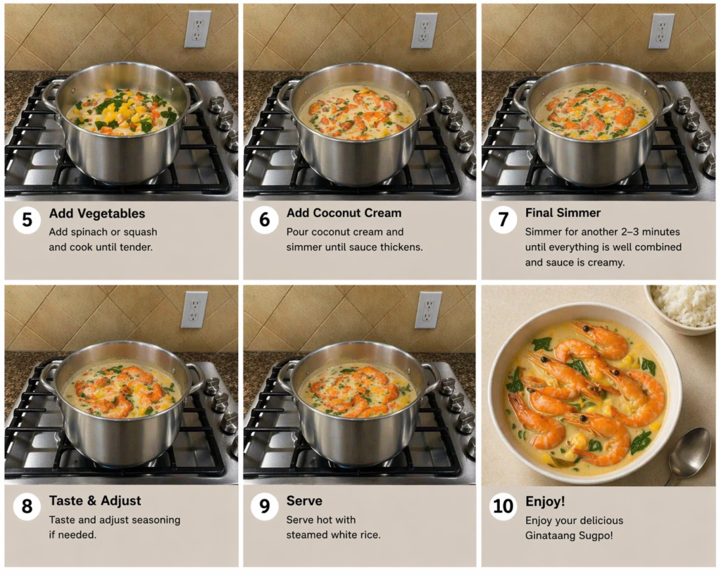 There are days when you just want something warm, creamy, and comforting β and for many Filipino families, ginataang sugpo is exactly that dish. The rich coconut milk gently coats the shrimp while the aroma of garlic and ginger fills the kitchen, bringing back memories of simple home-cooked meals shared with loved ones.