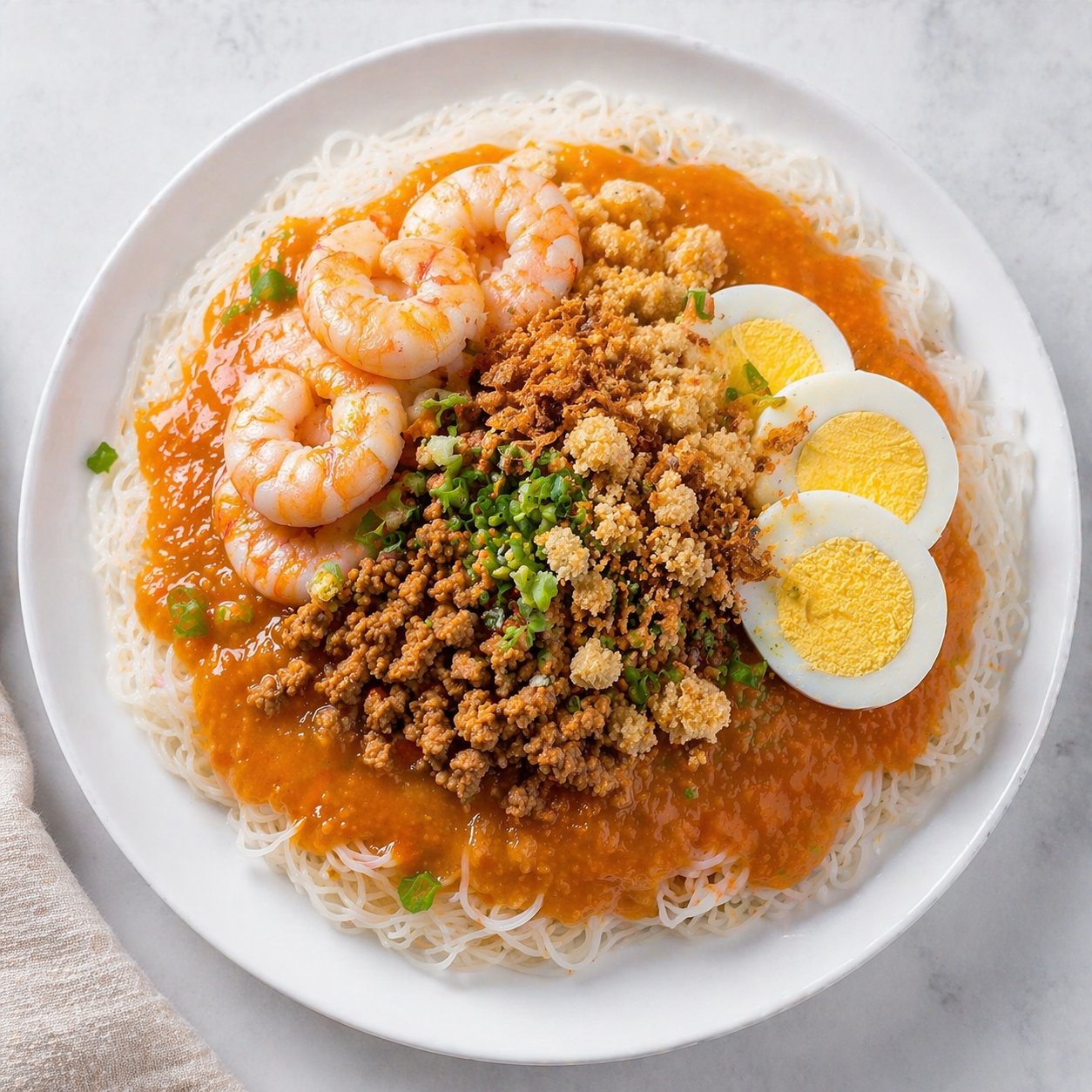 The bright orange sauce, infused with shrimp flavor, combined with soft rice noodles and topped with eggs, chicharrΓ³n, and green onions β€” it’s comfort food at its finest.