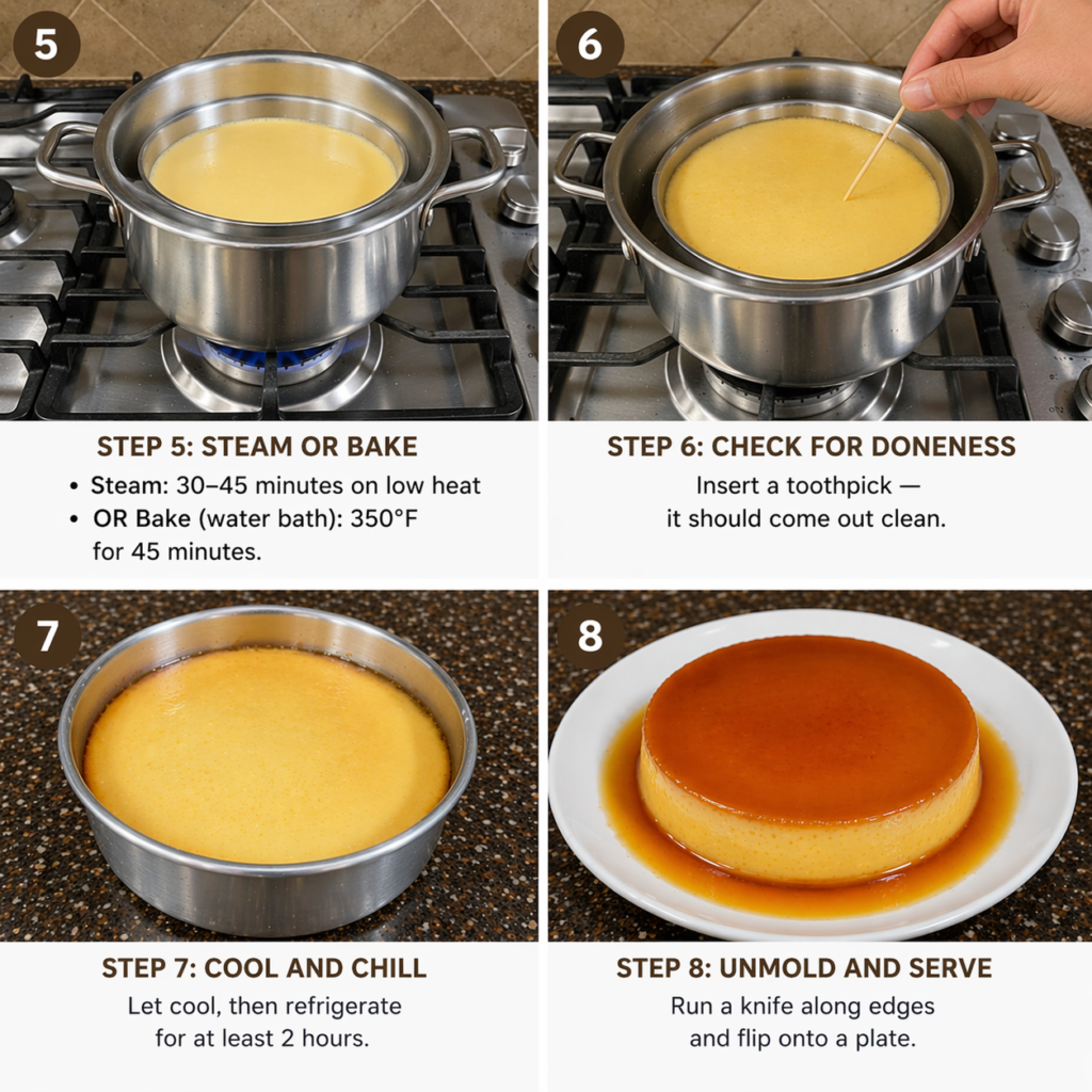 Mix ingredients β caramelize sugar β pour β steam/bake β chill β serve.