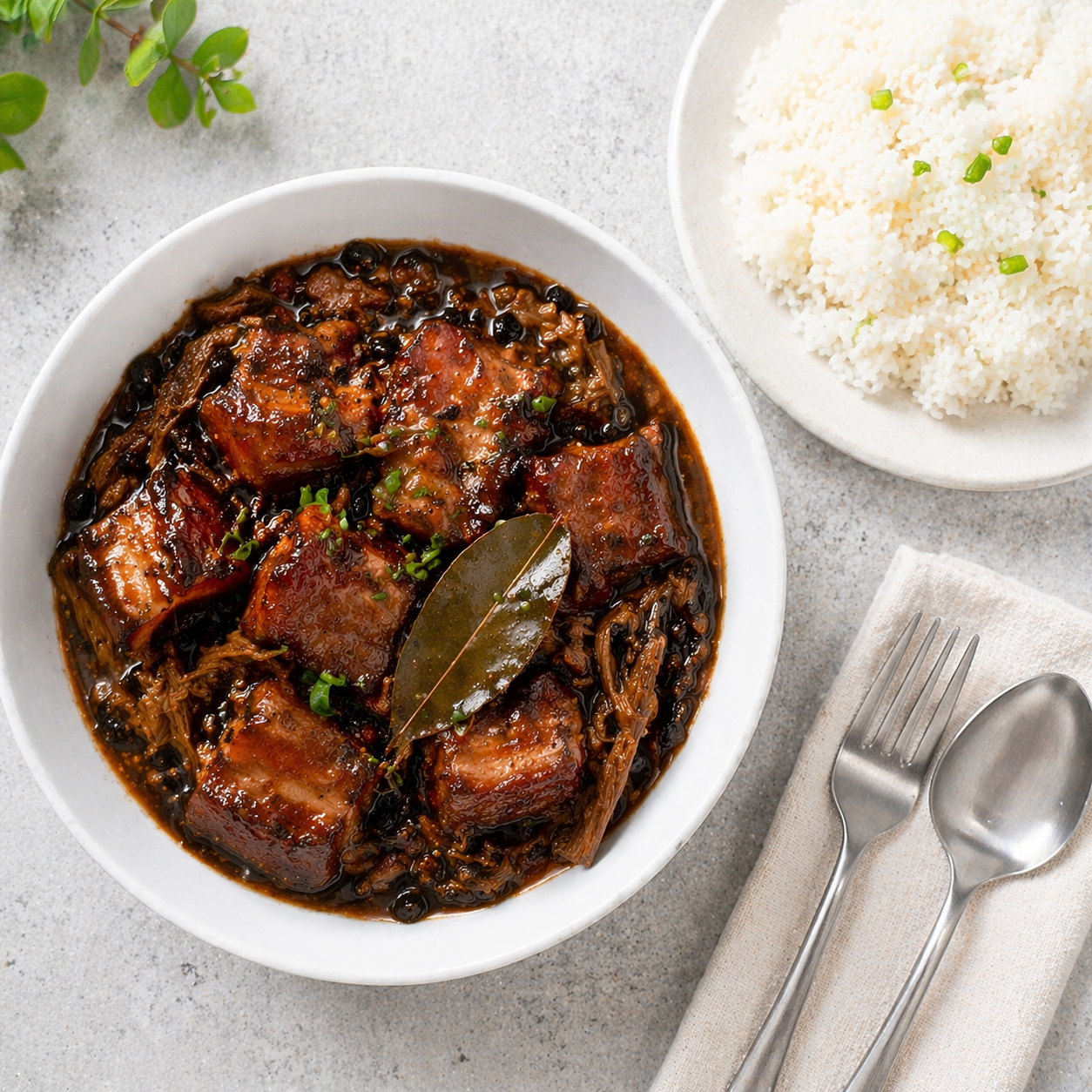 This Visayan-style braised pork dish is known for its sweet, savory, and slightly tangy flavor, often enhanced with fermented black beans and dried banana blossoms. It’s comforting, deeply flavorful, and best enjoyed with a big bowl of steamed rice.