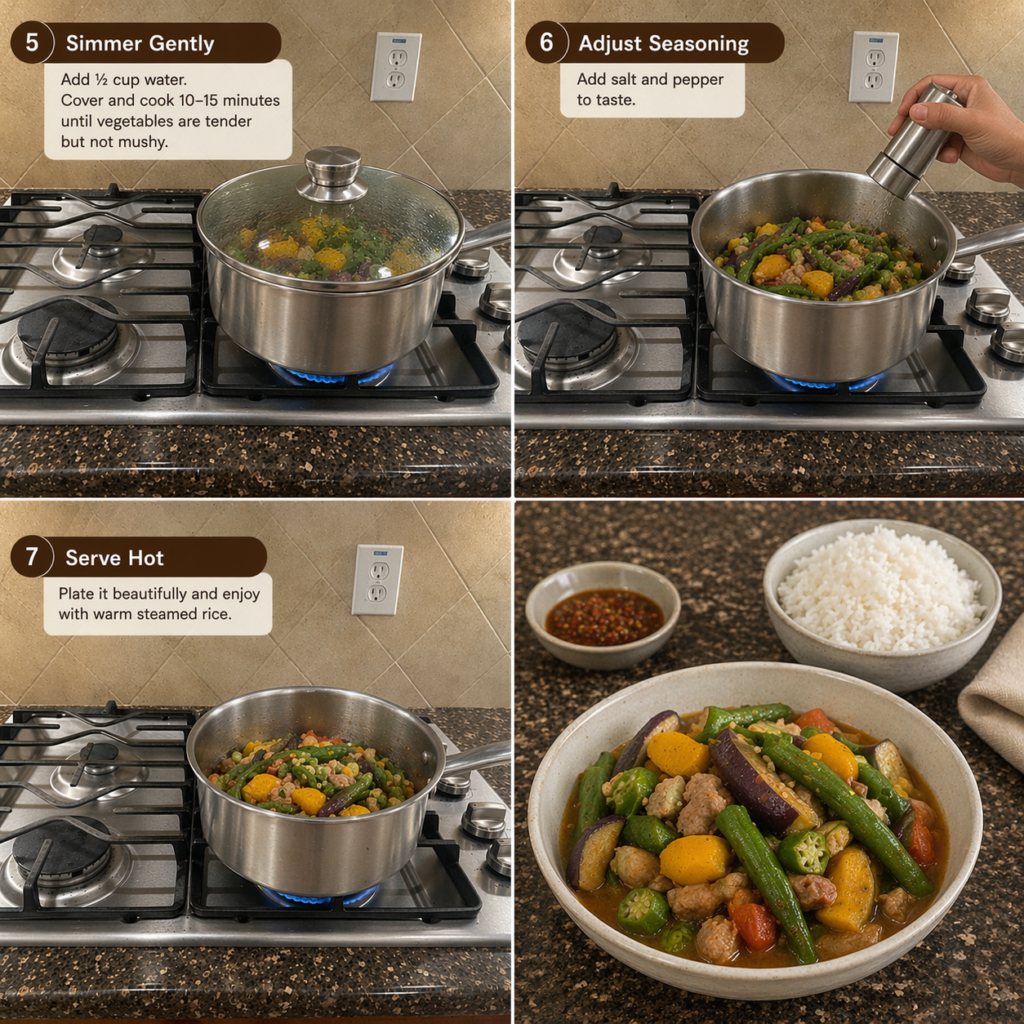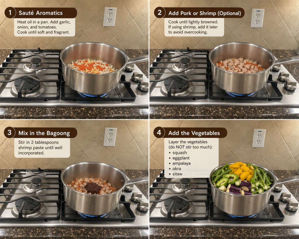 - Do not overmix — Pinakbet is layered, not sautéed aggressively.