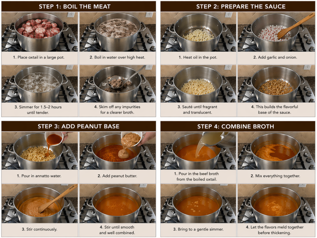 In a large pot, boil oxtail in water for 1.5–2 hours until tender. Skim impurities.