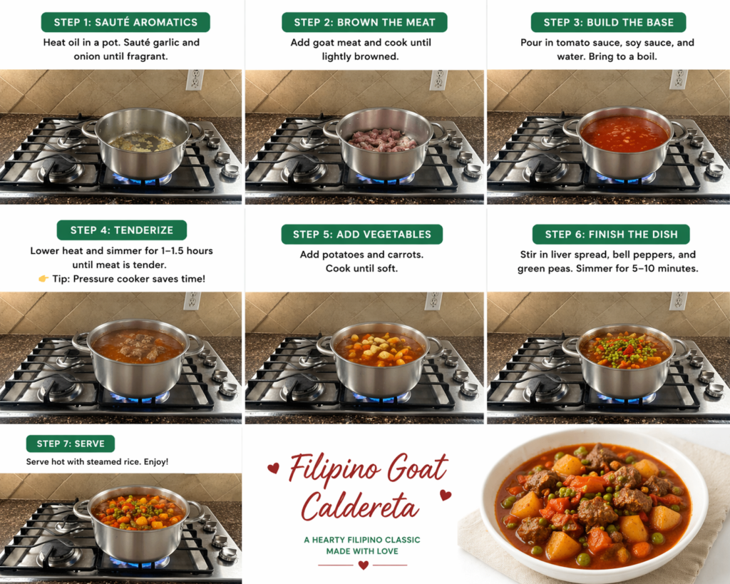There’s something truly special about a pot of Filipino Goat Caldereta simmering on the stove. Growing up, this dish was always reserved for celebrations — birthdays, fiestas, and family gatherings where everyone came together.