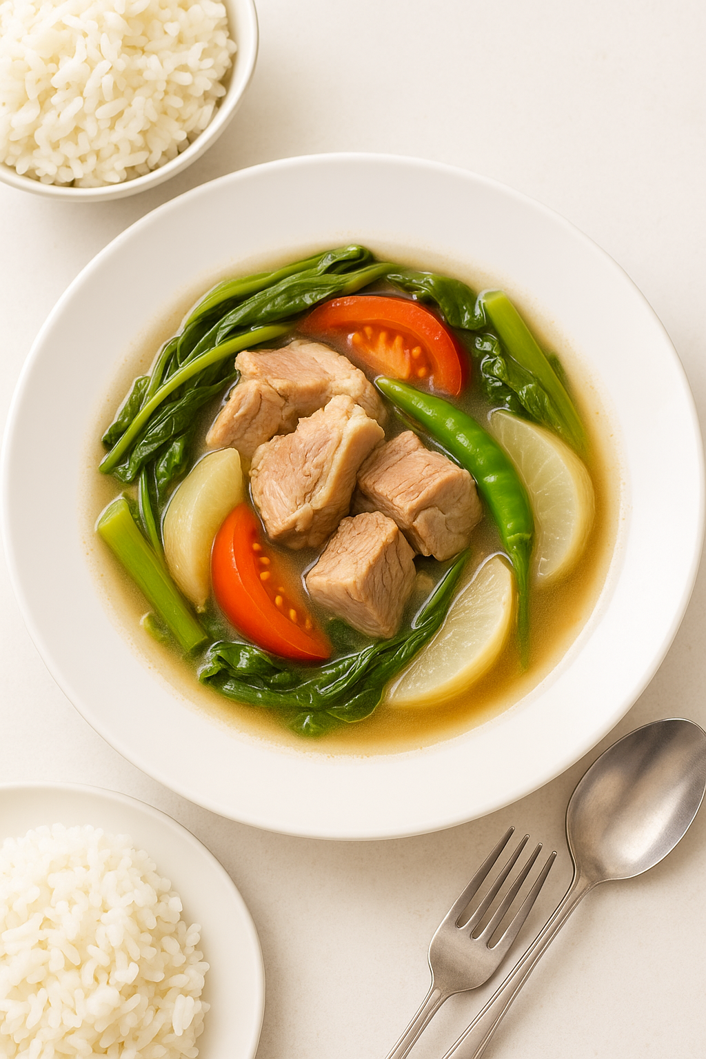 One of the most beloved Filipino dishes — warm, tangy, savory pork soup simmered with vegetables and tamarind.