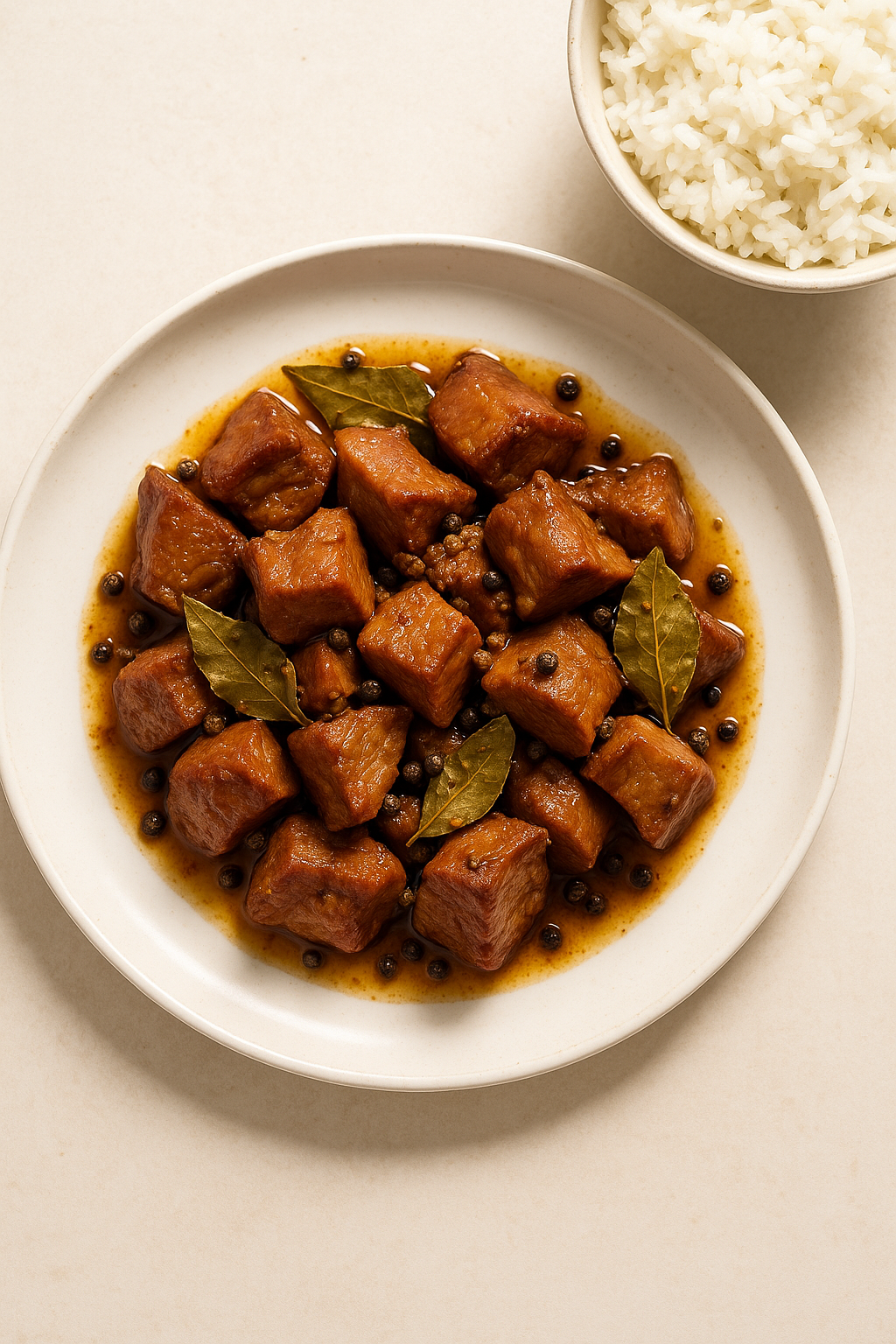 1. **Marinate the Pork**: In a bowl, mix the pork with soy sauce, minced garlic, bay leaves, and peppercorns. Let it marinate for at least 30 minutes, or overnight for the best flavor.